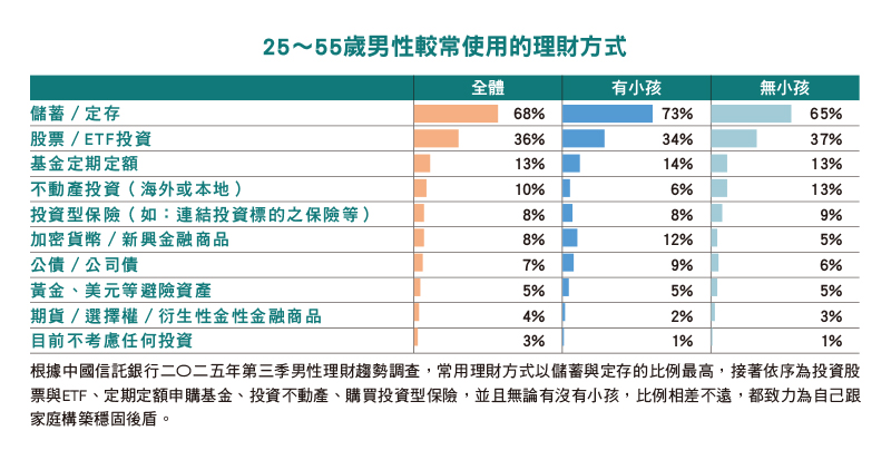 隨著越來越多男性認為理財能力跟工作實力同等重要,中國信託銀行針對二十五歲至五十五歲男性客戶,進行的「二〇二五年第三季男性理財趨勢調查」,便發現除了六八%有儲蓄與定存習慣,另外已有三六%投資股票與ETF、一三%定期定額申購基金、一〇%投資不動產、八%購買投資型保險,並且無論有沒有小孩,比例相差不多,都積極替未來預做準備。