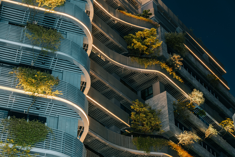 透過錯層陽台與退縮露台的精心佈局,「耕玉」呈現出律動的起伏;大範圍採行的垂直植栽綠化,讓綠意從地面拾級而上,延續至立面。在帶狀金屬格柵與透空遮陽板的交織下,搭配大片開窗映襯出的光影,使得整座建築彷彿在呼吸。這不僅賦予了都市綠意之意象,更創造了地區性的建築特色,讓都市風貌在轉角處顯得豐富多元。