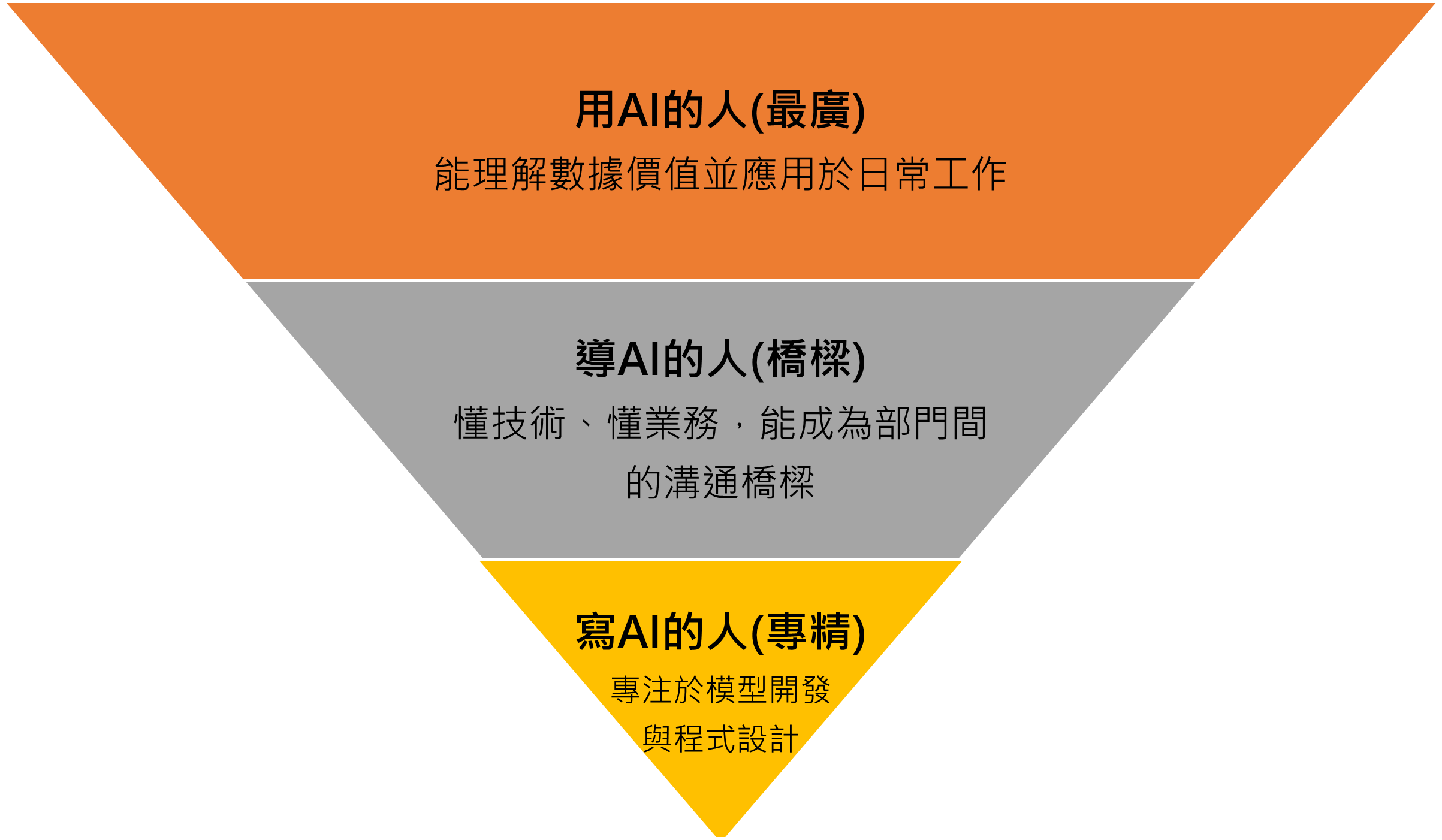 賴偉晏指出,為了甄別AI轉型人才梯隊,他將AI人才分為三層,呈現倒三角形:最上面第一層是最多人數的「用AI的人」,能理解數據價值並應用於日常工作;第二層是「導AI的人」,懂技術、懂業務規則,能成為橋樑;第三層是人數最少的「寫AI的人」,專注於模型開發與程式設計。